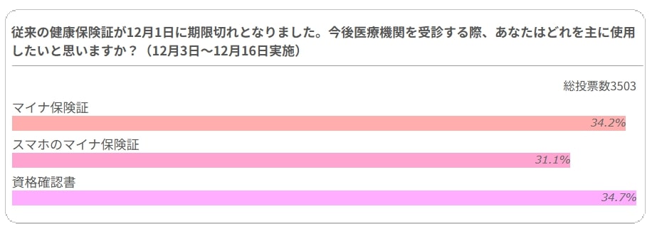 その結果、3,503人が回答し、「資格確認書」が1,216人(34.7%)と最も多く、続いて「マイナ保険証」が1,198人(34.2%)、「スマホのマイナ保険証」が1,089人(31.1%)でした。