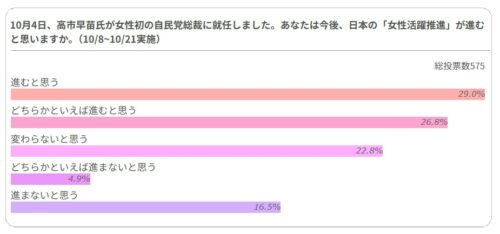 政治山では「高市自民党総裁の就任で『女性活躍推進』は進むと思いますか?」といった内容で、10月8日から10月21日にかけて政治山ユーザーにアンケートを実施しました。