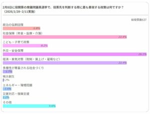 政治山では「2月8日に投開票の衆議院議員選挙で、投票先を判断する際に最も重視する政策は何ですか?」といった内容で、1月28日から2月11日にかけて政治山ユーザーにアンケートを実施しました。