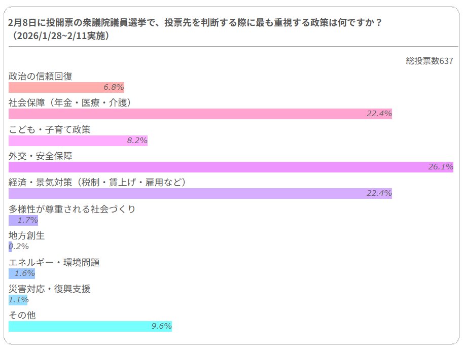 その結果、637人が回答し、「外交・安全保障」が166人(26.1%)と最も多く、続いて「社会保障(年金・医療・介護)」が143人(22.4%)、「経済・景気対策(税制・賃上げ・雇用など)」が143人(22.4%)でした。 その他の結果は以下の通りです。